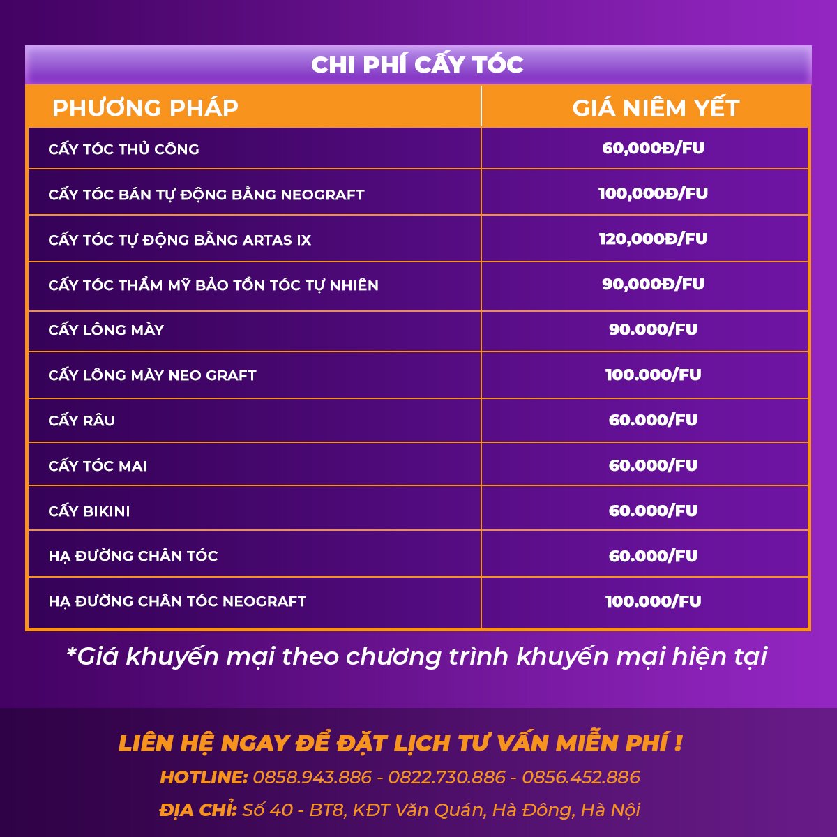 Nếu bạn phân vân chi phí hạ đường chân tóc giá bao nhiêu, hãy liên hệ ngay phòng khám đa khoa Hoàng Tuấn để được tư vấn và báo giá trong thời gian sớm nhất. Hotline 0858.943.886 - 0822.730.886 - 0856.452.886.